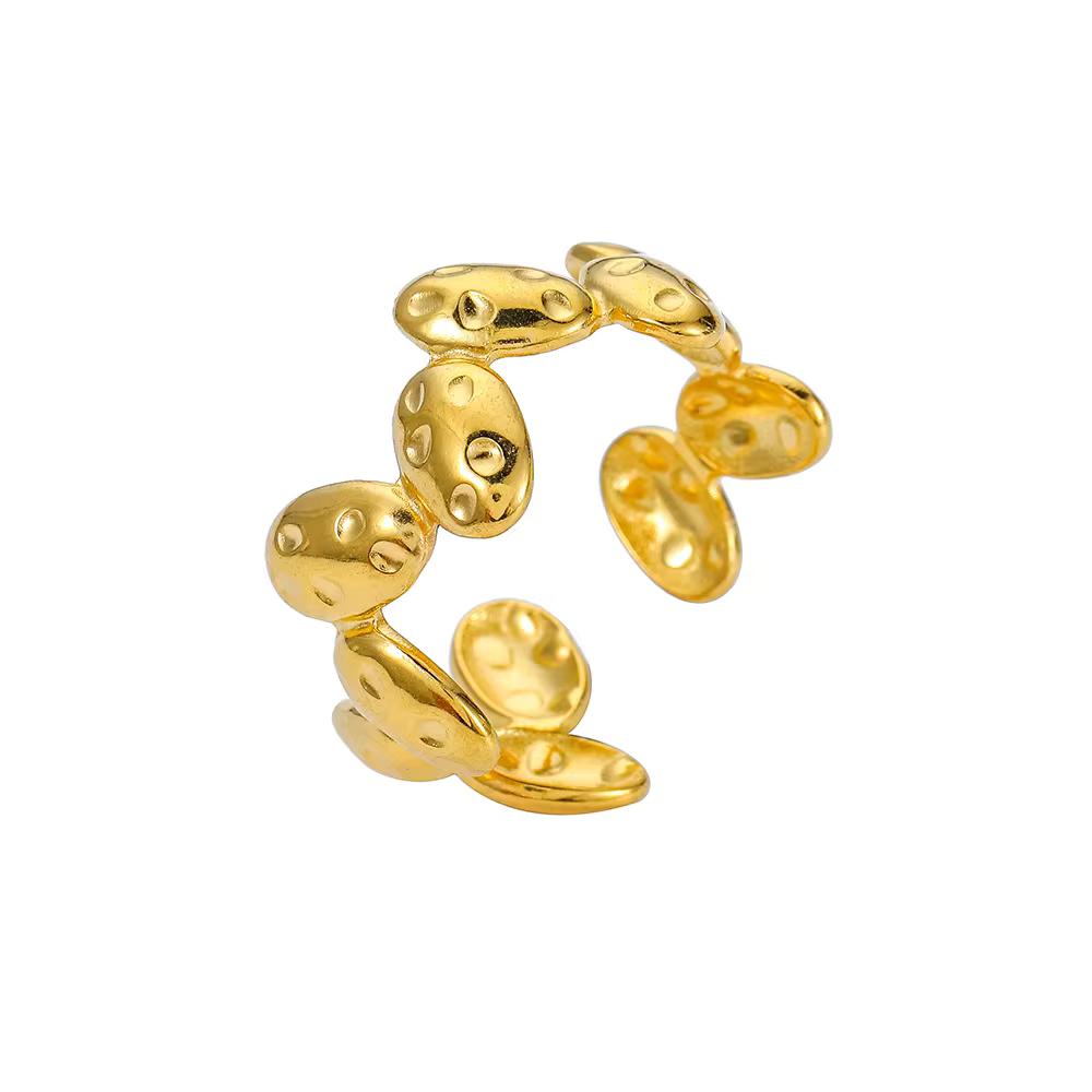 Adoptez un style unique avec cette bague dorée au design inspiré des galets ! Ses formes texturées et irrégulières lui confèrent un charme authentique et naturel. Ajustable et confortable, elle deviendra vite un incontournable de votre collection de bijoux.