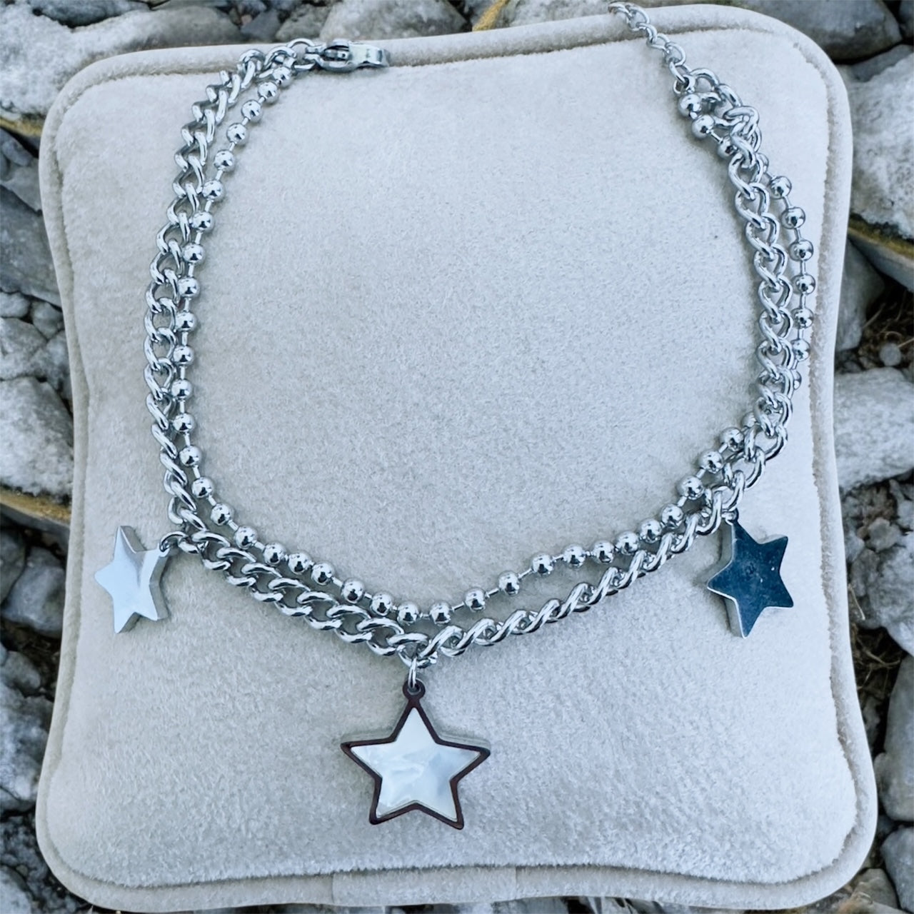 Brille avec audace grâce à Stella Mood, le bracelet double chaîne. Son design argenté mêle maillons et perles métalliques, rehaussé de trois étoiles qui dansent à ton poignet. Un bijou street & chic pour révéler ta lumière.